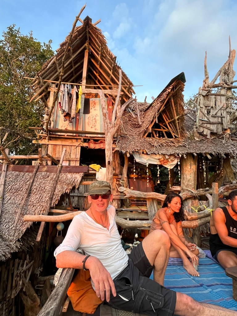We walk to the next bay along from ours. It cannot be accessed via the beach due to sharp rocks that block the path. This is where an unusual and artistic construction called the Hippy Bar is found. It was made gradually from wood washed up by the 2004 tsunami and needs to be constantly repaired. It is held together by rope and has a number of levels and many nooks and crannies where people can sit and chill.