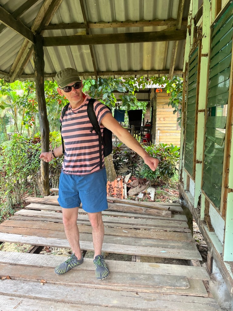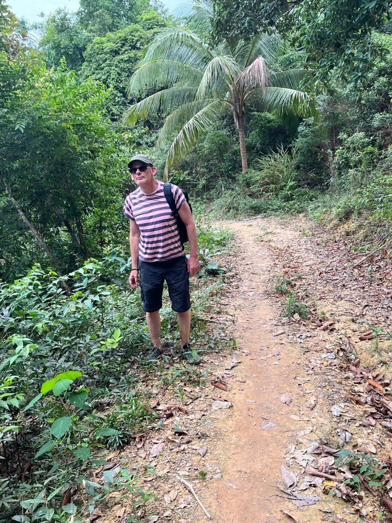 One day we decide to hire bikes to explore the island. There are scooters available, but we fancy a cycle ride. The island is only 5k in length and 2k in width, so it is easy to get around. We pass the beach that is home to the hippy bar and start on a jungle trail, leaving the bikes locked together, leaning against a tree. After about 15 minutes we reach a beautiful small beach. There has clearly been a resort here very recently that has now closed and fallen into disrepair. This must have been where our friends at the hippy bar have been camping. There is no sign of them but there is evidence of people’s presence in some of the less damaged huts.