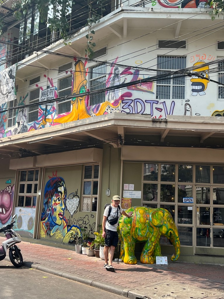 We had lunch in the Talat Noi area of Chinatown, where a few trendy coffee shops are opening up and the yuppies are beginning to move in. It is famous for its street art, which is quite impressive. For the moment, the main shops to be found are still engineering/ tool workshops, which Tim was interested in.