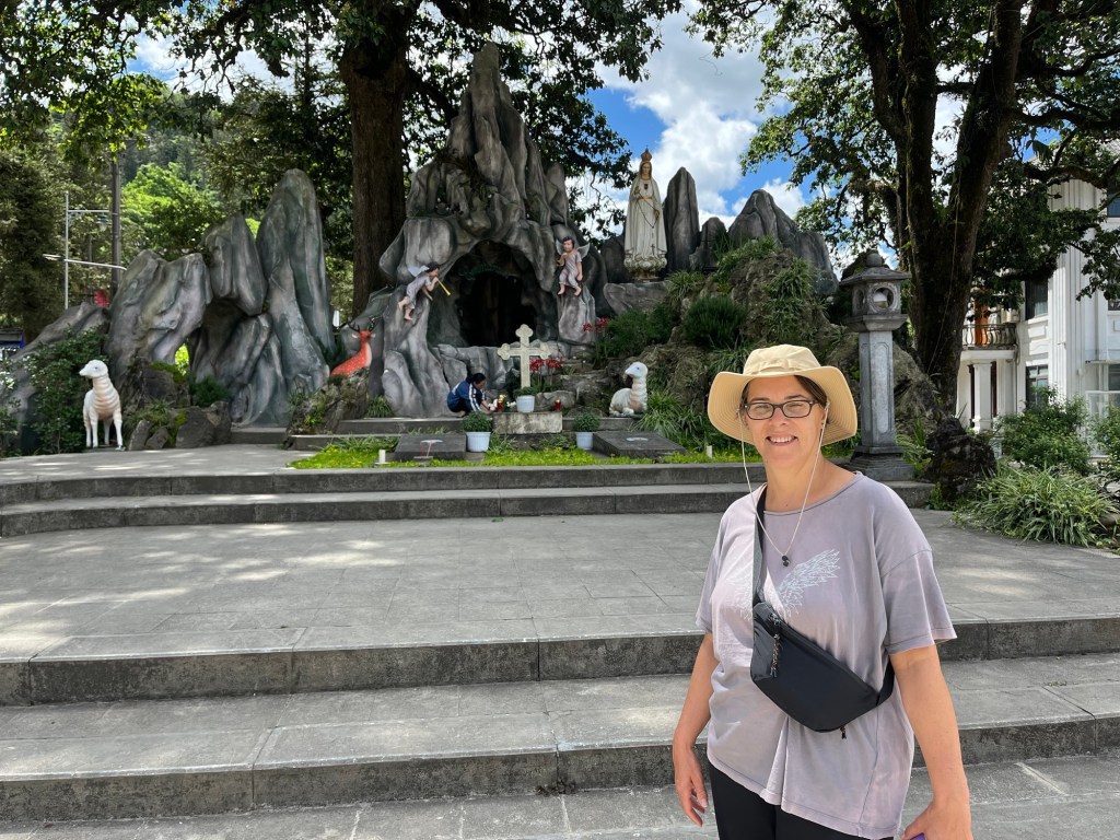 We spent the rest of the day exploring a slightly eccentric local park on a path leading up from the Catholic Church in the centre of town. The catholic church has a fantastically elaborate shrine/ grotto in its grounds. We followed a path through the park that led us past statues of various disney-esque/ manga children’s characters and then through expanses of flowers. Snack and drink vendors were stationed at regular intervals. Eventually the path snaked up to jagged rocks on the hillside where we gazed at Sapa and the surrounding countryside from a viewpoint. By lunchtime we were exhausted and headed towards a cafe, where we fuelled up before making our way back to Jungle Lodge for a well earned rest.