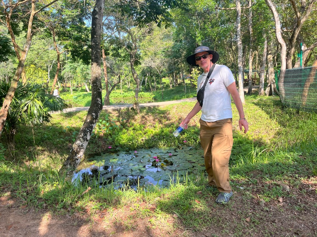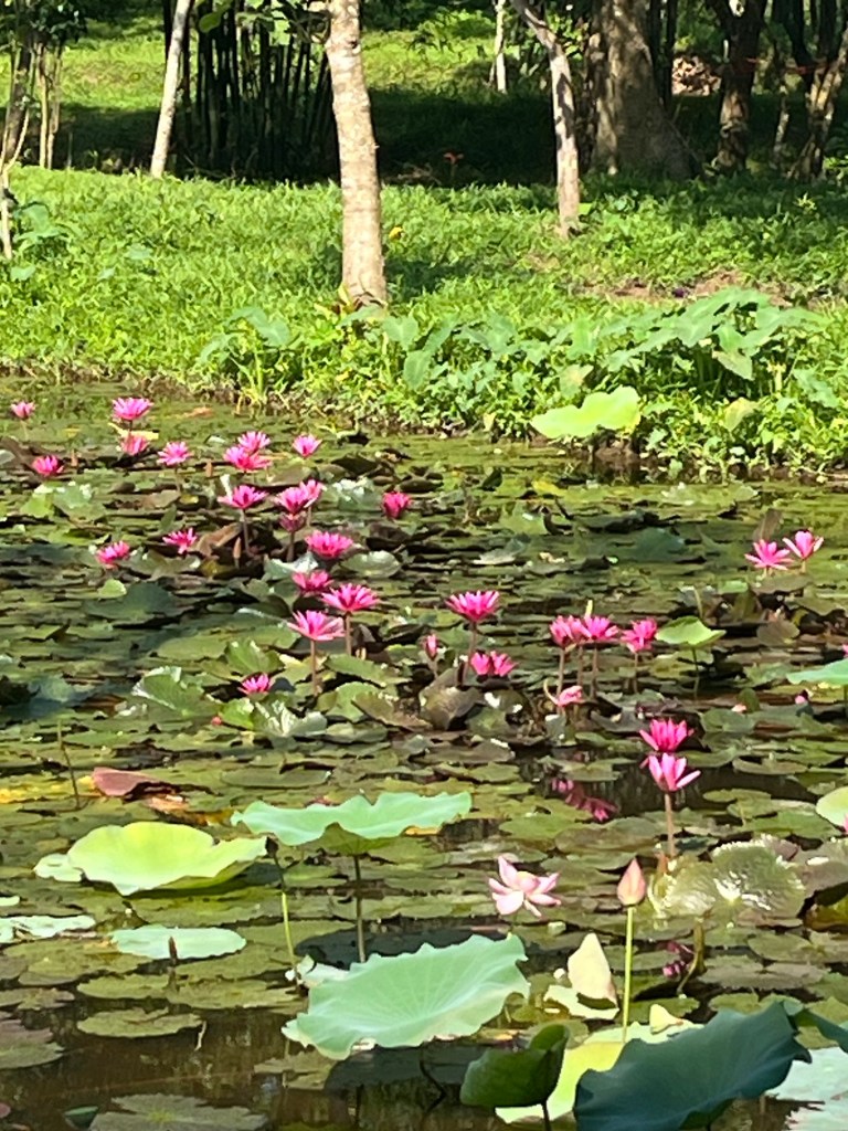 My Son is surrounded by bomb craters. A number of them have been turned into beautiful pools filled with lotus flowers and ringed by orchid plants. There is still some unexploded ordnance in the woods around the site. A lot of the temples, which were built between the 4th and 12th centuries were destroyed in the war. Like at the temple we visited in Laos, there has been a partnership with the Indian government to fund restoration of the monuments and a skilled job has been done. Van pointed out to us what bits of the monuments were restoration and what was original.