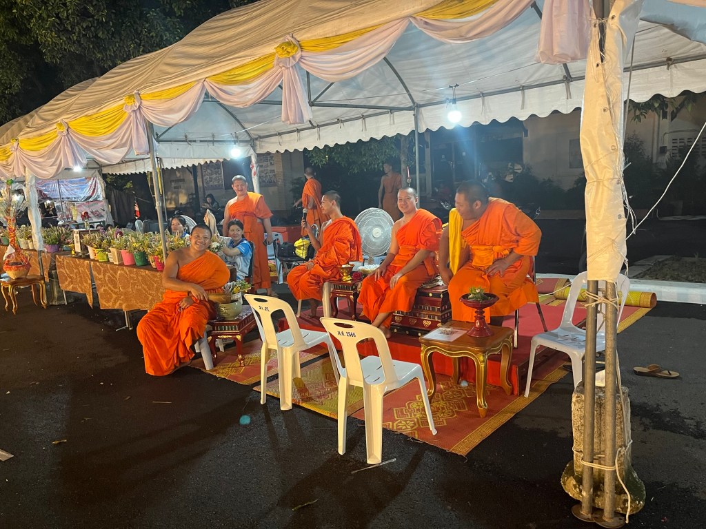 We watched as water was hauled up in containers and splashed onto the sides of the stupa. Inside the wat lots of merit attaining activities were happening. People were giving money to buy coins that they then distributed between lines of receptacles. They were also purchasing gold leaf and attaching this to a line of statues.