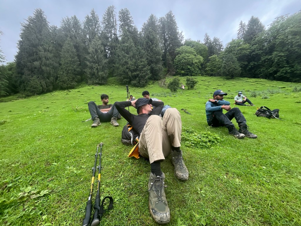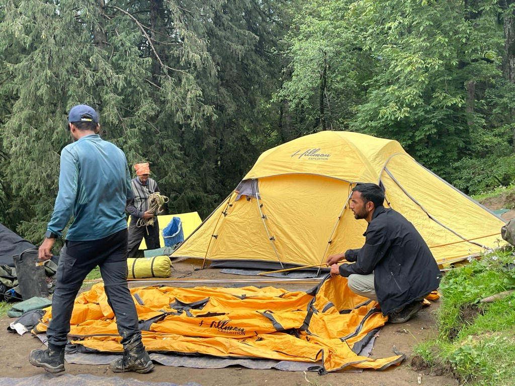 Our first days’s hiking was mainly through a wooded forest area with a great variety of ancient trees. We rested at a beautiful meadow before trekking further to another meadow area where we were to camp. Suraj told us that today he would give us a demonstration on how to put tents up. The Indiahikes philosophy is that everyone should hike and a hike teaches people the skills they need to trek independently with their friends. Luckily Tim was in my group, as my talents are not really showcased in practical areas such as putting up tents. In fact I am more of a hindrance than a help even when taking direct orders. As we began to put the tent up it started to rain, which didn’t help. We finally managed it and were allocated tents to sleep in. I was relieved that as the tents were two person, I would be sleeping with Tim. We were all getting wet by this time, so after ensuring our bags were safe we headed for the communal mess tent.