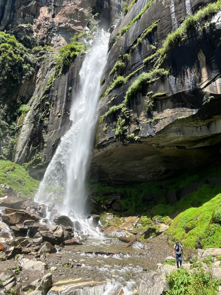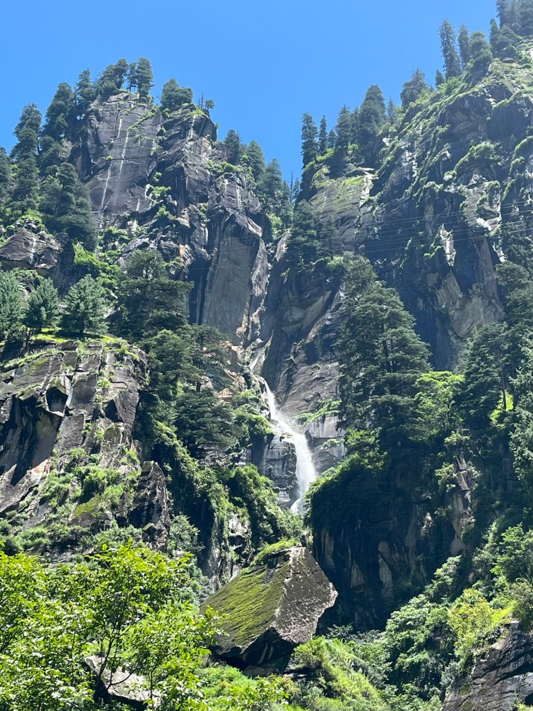 We headed through the winding streets of the village, greeting cows, dogs and villagers carrying fodder on their heads. They were all very welcoming. The path towards the waterfall was dotted with small cafes or dhabas, some with great views of the magnificent surrounding countryside, but we managed to avoid their lure, intending to feast after we had finished our walk. Efforts had been made to maintain the environment with regular notices discouraging littering. Some of the best were ‘A girl must break up if her boyfriend is a litterbug’, ‘In the forest and mountains animals do not leave trash, humans do, please behave like animals’ and my favourite ‘Please clean up after yourself, your Mother does not work here’.