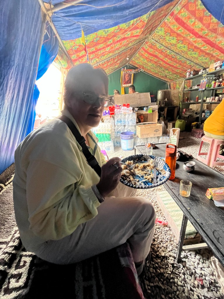 We had no idea which direction to walk in order to find our homestay. It looked like it would take about thirty minutes on google maps, but Tim was convinced that there must be a shortcut as google only showed the route along the main road. There were no taxis or autos. I chatted to some local men hanging around the bus station who pointed us across a small water channel. Other people along the route all seemed to know where Amma Homestay was and led us down an alley. We ended up on the main shopping street of Keylong. There was an area covered against the scorching heat of the sun and a few shops selling essential goods as well as a barber’s and a few hotels, dhabas and one attractive looking cafe called ‘The Climbers cafe’. A local woman who was sitting and knitting in a doorway pointed us down a set of steep steps leading downhill towards the homestay. The walk couldn’t have taken more than about 15 minutes in total.