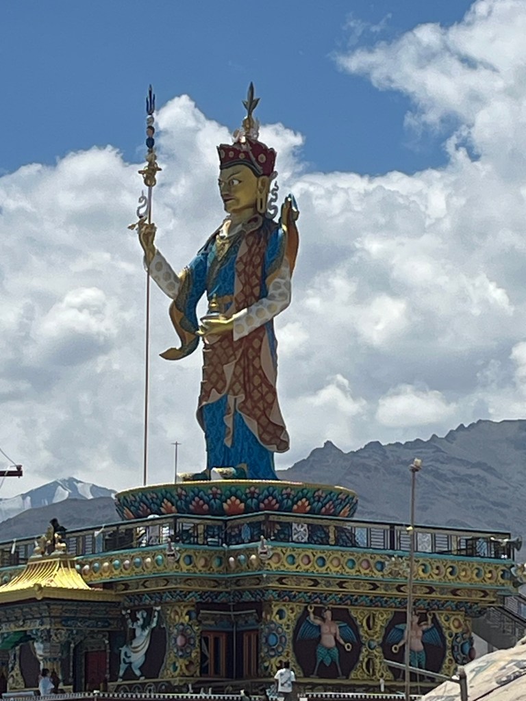 Next, we headed for Shey Palace. A modern Guru Padmasambhava statue (also known as Guru Rinpoche – revered in Tibetan Buddhism) towers next to it. We headed up the long flights of steps that all Buddhist monuments seem to require you to negotiate prior to entry. We were rewarded by views of the surrounding countryside and a temple containing an enormous golden Shakyamuni Buddha statue (Siddharta – historical founder of Buddhism). This is contained within several floors of the monastery, so inside the temple we could only see his head.