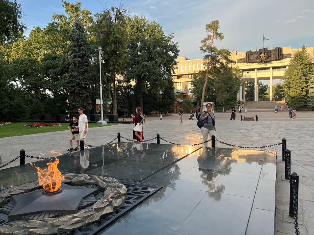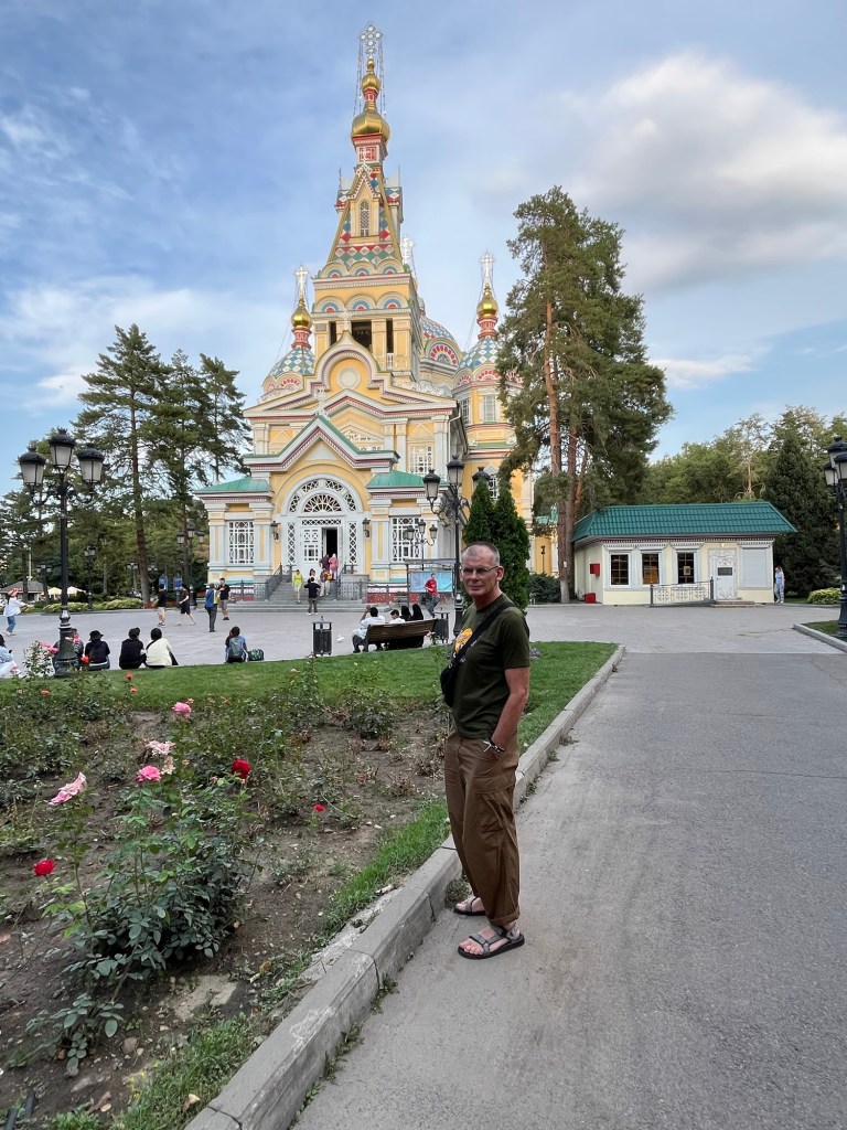 We freshened up and wandered out in the cooler evening air to explore. Almaty is a city of wide boulevards, trees and parks. Only about ten minutes from our hotel we came across Ascension Cathedral, one of two Russian orthodox cathedrals in Almaty. This first day we viewed it from the outside but the next day when we spent some time inside it we met a Russian man who told us a bit about its history. Following an earthquake that destroyed a lot of the city, the Cathedral was built of wood to an earthquake proof design. The architect was seen dancing for joy outside it after an earthquake struck the city and it survived.