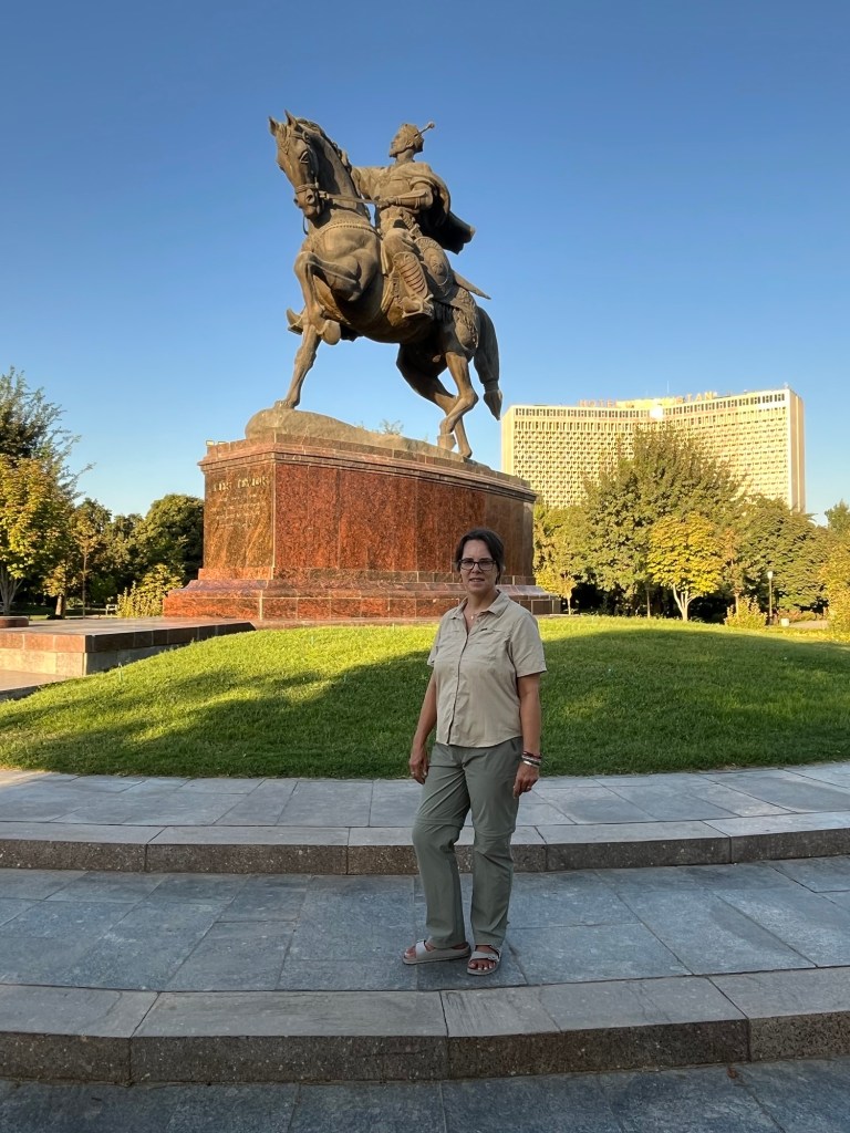 After our football chat we set off to explore the city. We were tired after our early start so we decided to head for a big park. We wandered among the statue of Timur and well tended trees and shrubs. A massive brutalist Soviet hotel loomed in the background. Whatever you think of the architecture, it is a spectacular building.