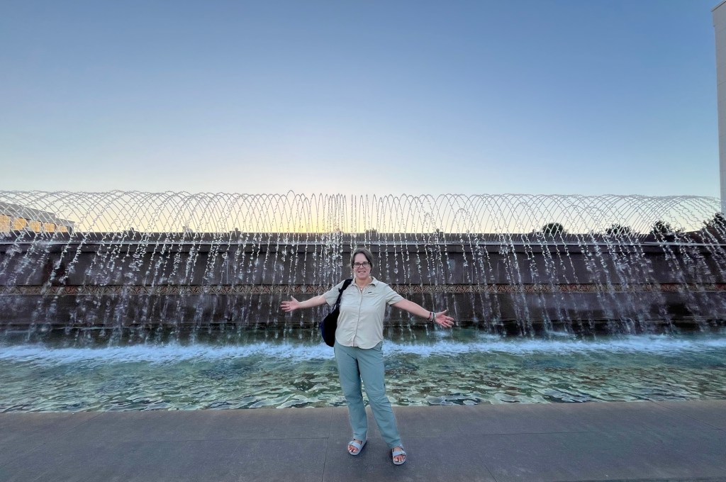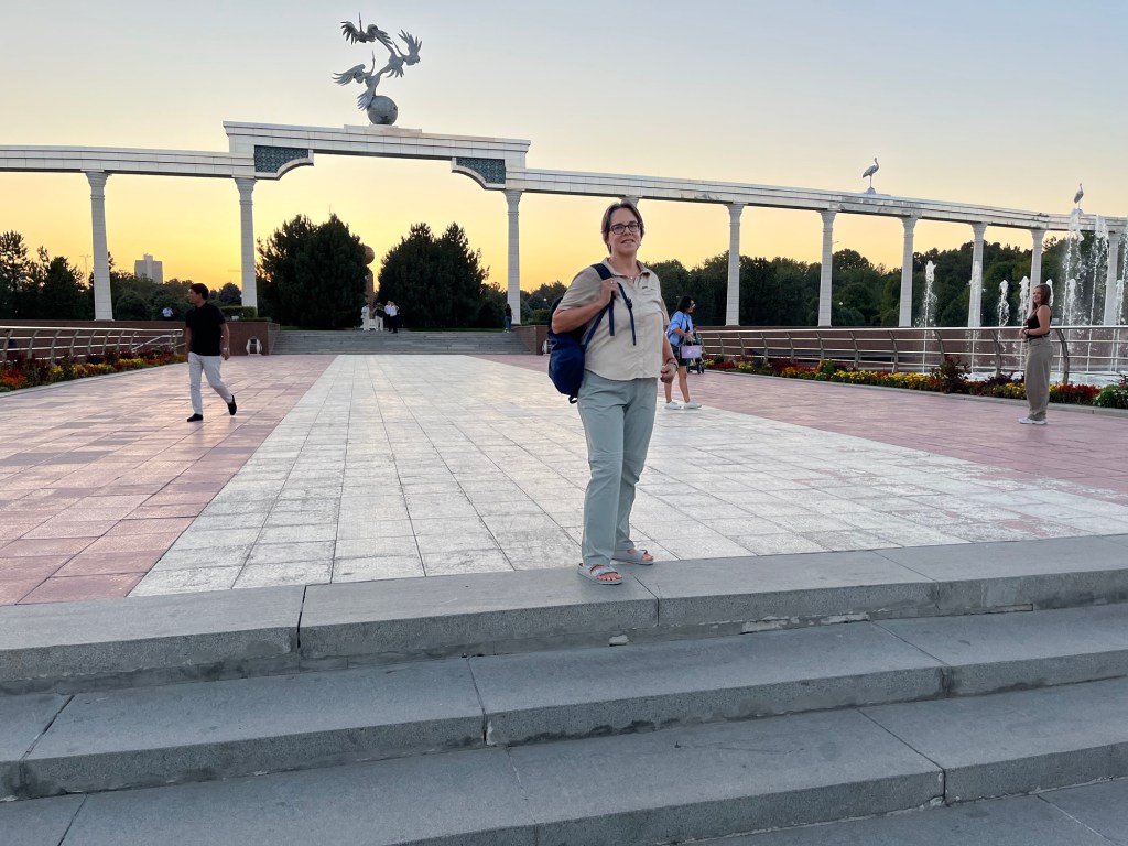 We came upon a magnificent section of fountains in front of government buildings. We had reached Independence Square. On an arch towering above are models of storks, the national symbol of Uzbekistan. They stand for peace and prosperity in Uzbek folklore. All the old Soviet statues have been removed. It was lovely walking in the cool of the fountains as the sun was setting.