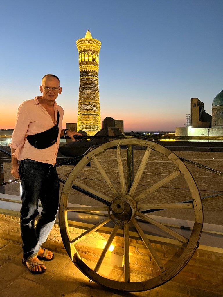 I had a rest in the hotel the next morning as I was feeling tired and ill with the cold/ covid I had caught. Everybody in Bukhara seemed to be coming down with it – everywhere we went we heard coughs and sneezes. Tim had a wander of the town on his own and as the day cooled down I felt recovered enough to explore some sights near our hotel. These included a beautiful mosque and a nearby minaret, Chor Minar.